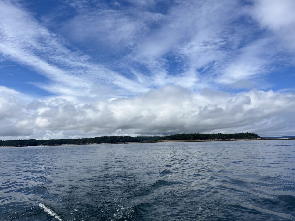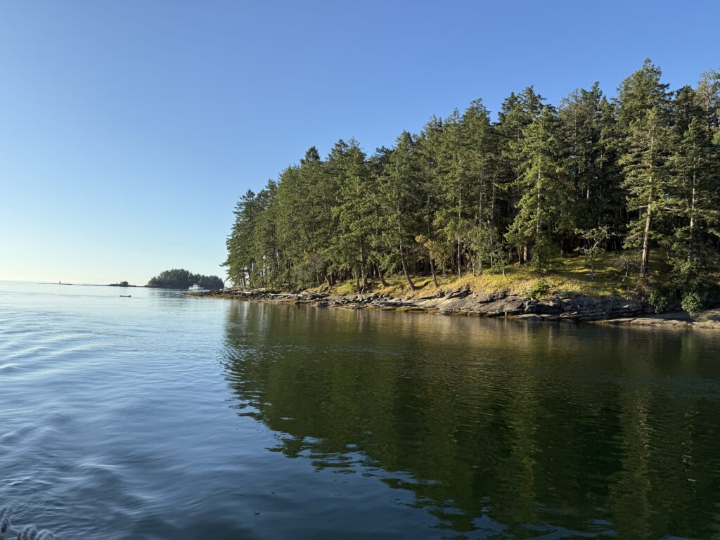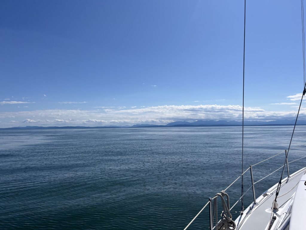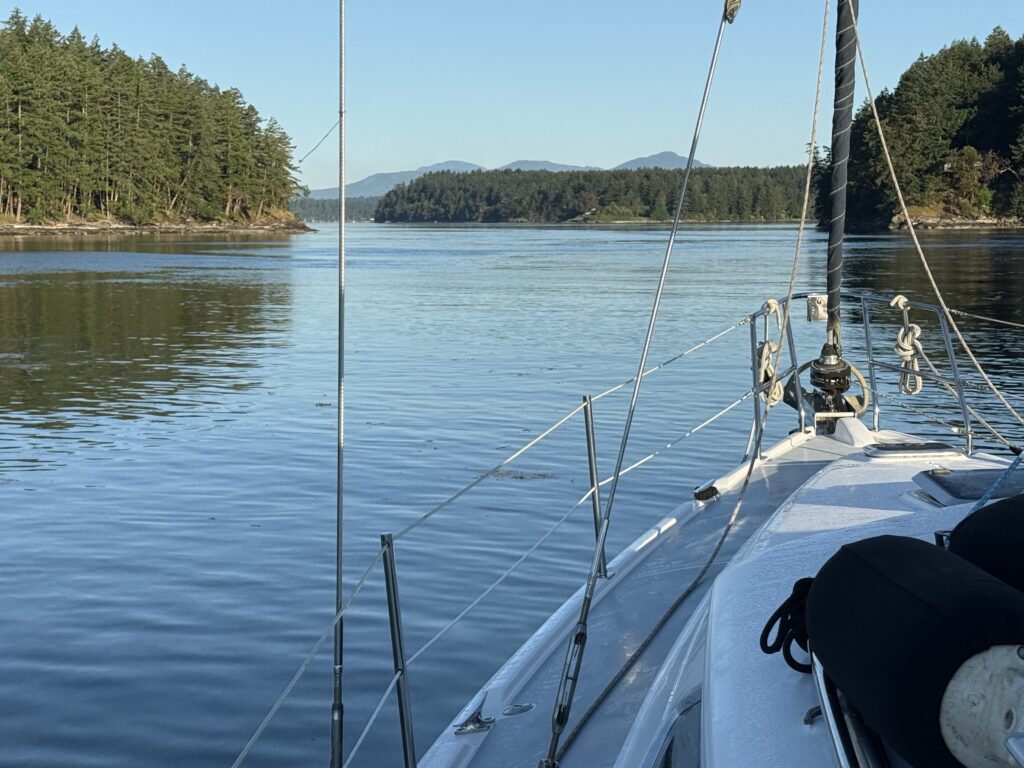 Vancouver, BC (Jul 12/25) – It was a classic summer day in Vancouver, cloudless blue sky, fair winds from the north-west & relatively calm seas, the ‘Spirit Bear Crew’ having prepared for this exploration with much anticipation …it was a good time to cast off and venture across the beautiful Salish Sea to Vancouver Island’s Gulf Islands. The winds picked up enough to unfurl the foresail which generated about 5 knots of speed. The tide was just turning to a flood (ie. the tide was coming in) thus a heading was set slightly south, allowing Spirit Bear to arc north-west to the intended destination of Silva Bay on Gabriola Island.