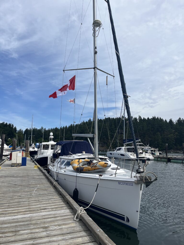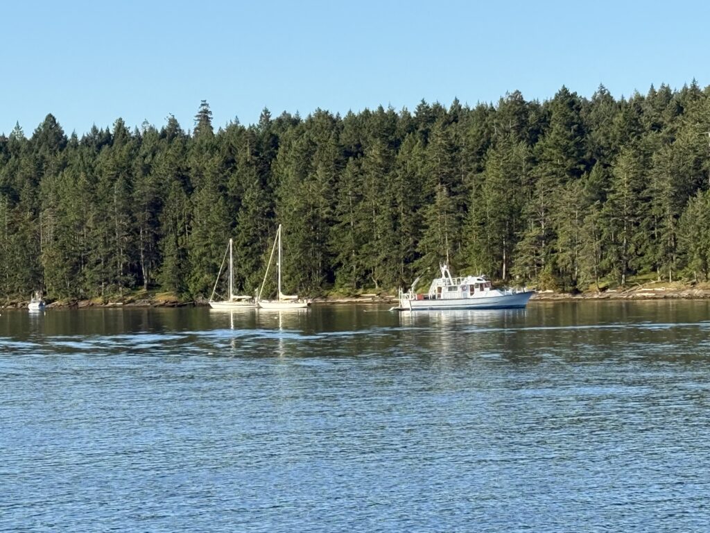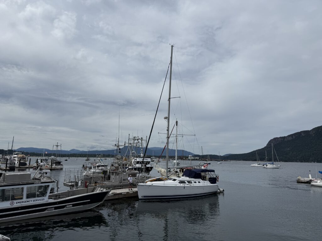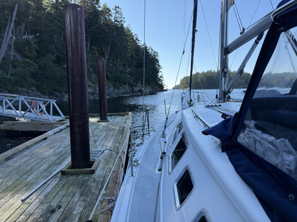 What seemed like an eternity (though in reality only 10-15 seconds) Spirit Bear managed to gain some speed and was steered into Degnan Bay (northwest of Gabriola Passage) before the engine gave its final sputter and shut down completely. The first thought was to drop anchor as far from the pass as possible. But glancing at the water, they saw the current had already shifted and was quickly building strength, ready to drag the boat back the way it had come. Thinking beyond the obvious, the crew jumped into action …N spotted a private dock nearby and took the helm, while J rushed to hang fenders on the port side (on the ‘left side’ for you landlubbers) and ready the dock lines. With calm precision, N manoeuvred Spirit Bear alongside the float—perfectly, and without any power.