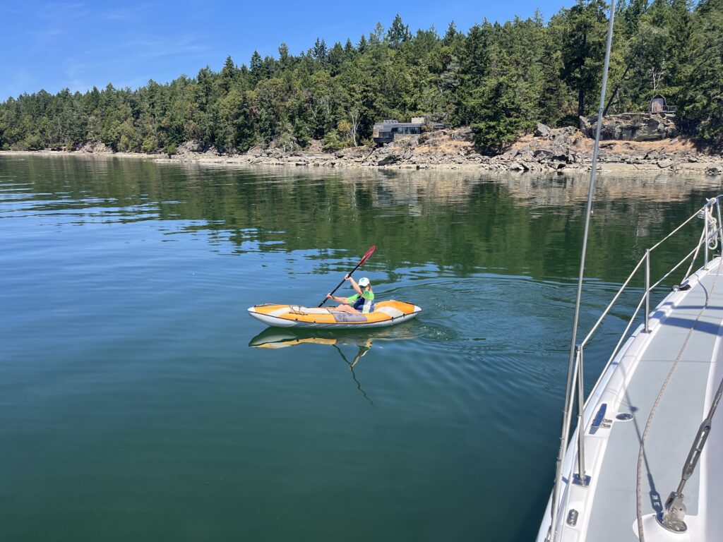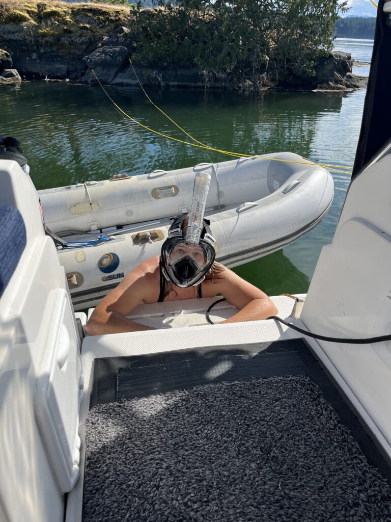 Upon arrival after ‘threading the needle’ to navigate the small islands & hidden rocks to Silva Bay, it was discovered that anchoring in the bay would be difficult considering the preponderance of ‘private’ mooring buoys. Settling on a spot in the northern flanks of the bay, ensuring not to block the passage way used by the float planes that frequent the harbour …a firm anchor was successfully set. Watchful eyes of Jesse, tasked with making sure the float planes coming and going did not veer off course.