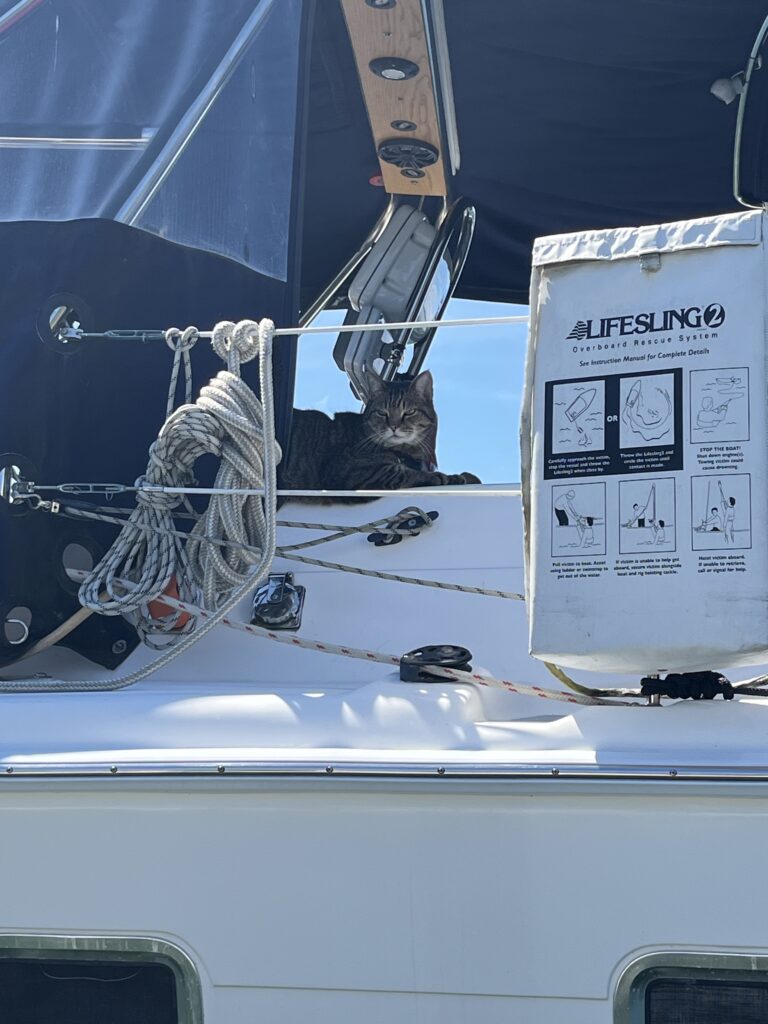 After settling in for the evening, the next day brought an outing to the provincial campsite, with its hiking trails and shell beach on the far side of the peninsula. This was a particularly special occasion as this was Jesse’s very first dinghy ride!! Jesse wide-eyed with a touch of nervousness was securely seated in his go-kart and carefully transferred onto the dinghy. Jesse couldn’t believe his eyes, the dinghy and crew skimming smoothly across the water, not even a meow of protest could escape. The newly purchased Torqeedo electric outboard motor provided an exceptionally quiet ride (no loud gas motor anymore), helping ease much of Jesse’s innate fear. Rewarded with hiking the trails, climbing the trees, and stalking the squirrels, Jesse deciding that the transport across the bay over water was worth it!