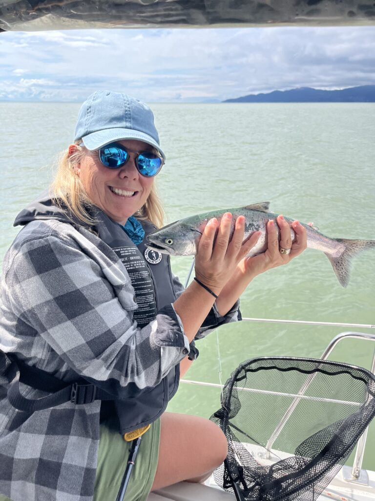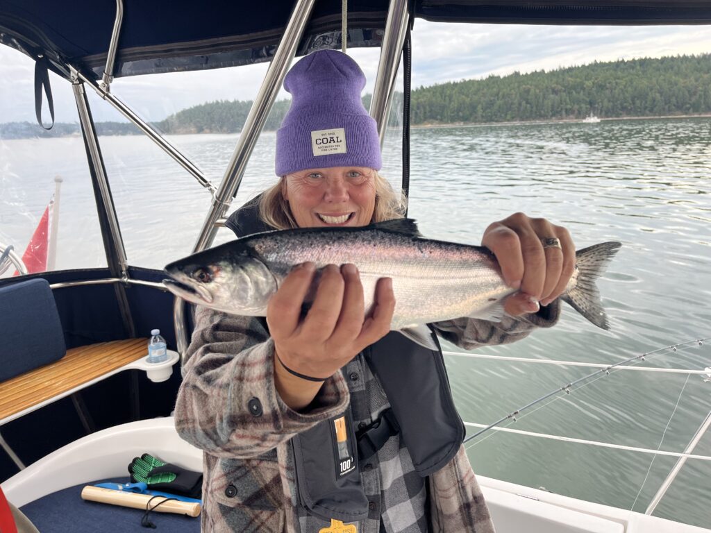 As N&J kept a clear eye on the weather forecast it was looking like their time away was closing in and it was time to start heading back to the mainland. Today’s destination would be a repeat visit to Silva Bay, this time to the VRC outstation located at the Silva Bay Marina. While waiting for the slack tide to make it through the pass at Gabriola, N decided to try her luck at fishing and was successful! After a quick photo this colourful salmon was placed back in the water and without hesitation quickly swam away with exuberance, happy to live another day.