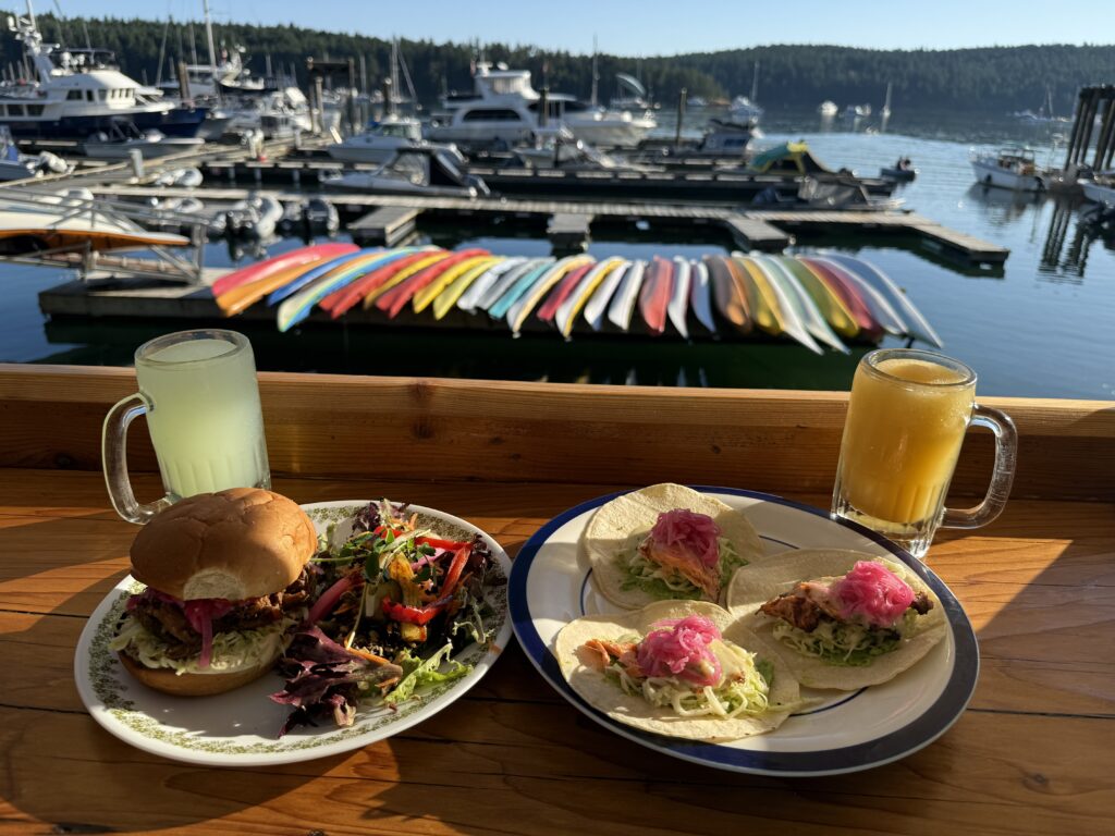 Spying a mirage of colourful kayaks along the southern shoreline of Montague N decided to jump into the inflatable kayak to check out the action. The smell of grilled food wafting from the shoreline enticed N further to meander in to the local restaurant called the Crane and Robin. Perched right above the public dock looked like a perfect place to enjoy a bite and watch the parade of boats through the harbour so with a quick paddle back N encouraged J to come along. While seated gazing out onto the magical scene, a feast of seafood tacos & a spectacular burger was enjoyed. Making a plan for their next visit here will include the “colourful” bus ride to The Hummingbird Pub on the other side of the island.